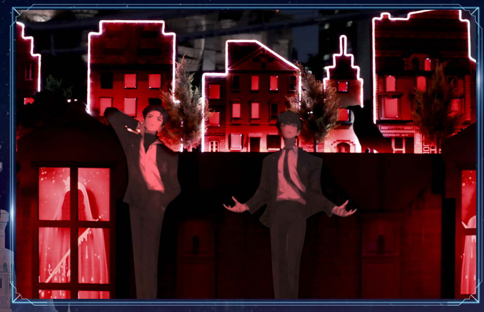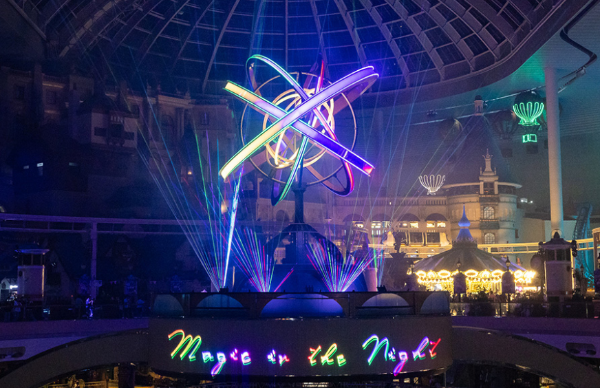 일몰 후 매직캐슬 벽면에 화려한 영상이 펼쳐집니다.