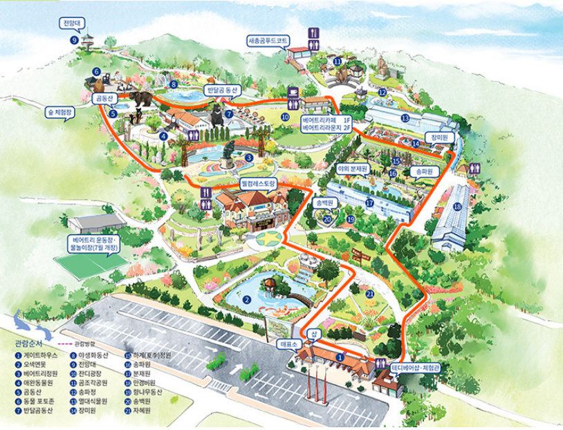 10만여 평 대지 위에 백여 마리의 반달곰과 불곰, 공작, 꽃사슴이 뛰놀고, 1000여 종, 40만 여점에 이르는 꽃과 나무들이 즐비하게 늘어선 국내에서는 보기 드문 ‘동물원과 수목원’ 입니다.