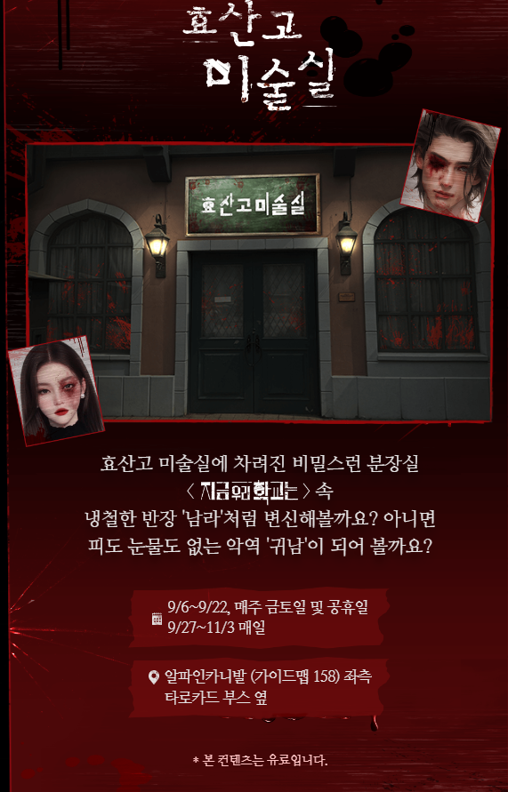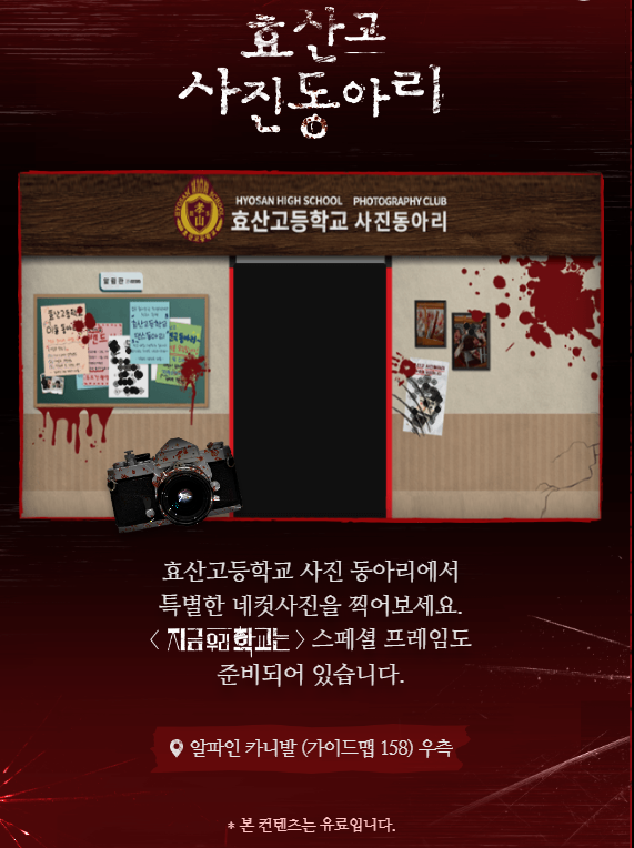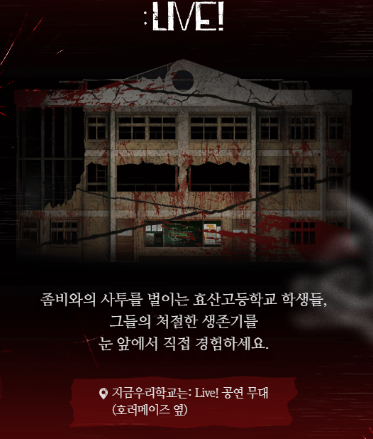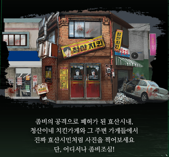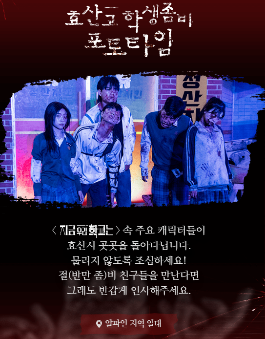 효산고 학생들의 생존기를 눈앞에서 볼수 있으며 알파인일대지역에서 좀비와 함께 포토타임도 즐길 수 있습니다.