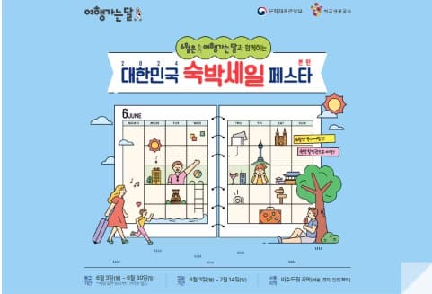 2024년 여름휴가를 계획하고 있다면 조금 더 빠르고 알뜰하게 여행을 준비해 보면 어떨까요? 6월 3일부터 6월 30일간 대한민국 숙박할인페스타에 참여해 보세요. 지난 5월 28일부터 30일간 지역특별할인기간을 놓쳤다면 이번에 꼭 놓치지 마세요.