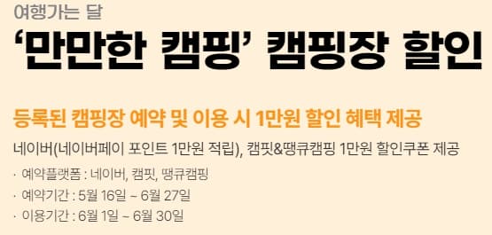 알뜰한 캠핑족이라면 6월 1일부터 30일까지 30일간 일부 캠핑장에서 1만원 할인을 받을 수 있다고 하니 홈페이지에서 확인하고 이용하시기 바랍니다.