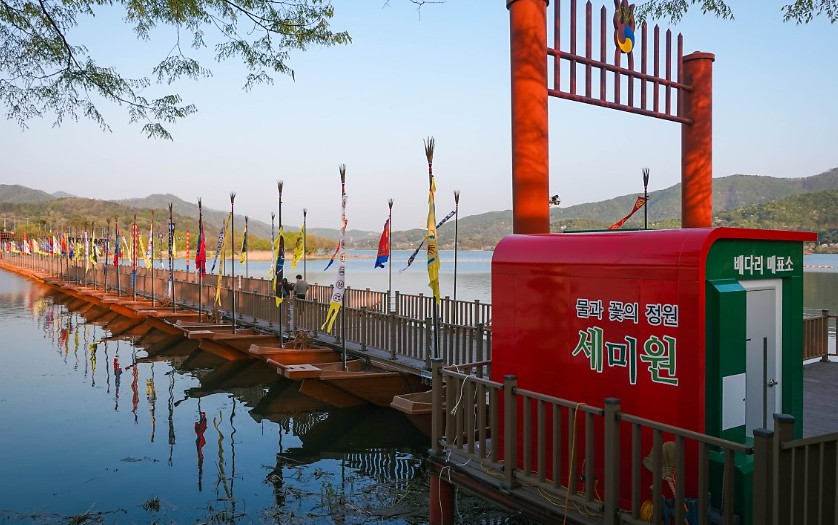 배다리 : 정조가 사도세자의 현륭원을 방문시 한강을 건널 때 수십 척의 배를 연결해 다리를 만들었다는 사료를 바탕으로 제작된 부교로 세미원 입장객이 도보로 두물머리까지 갈 수 있다.