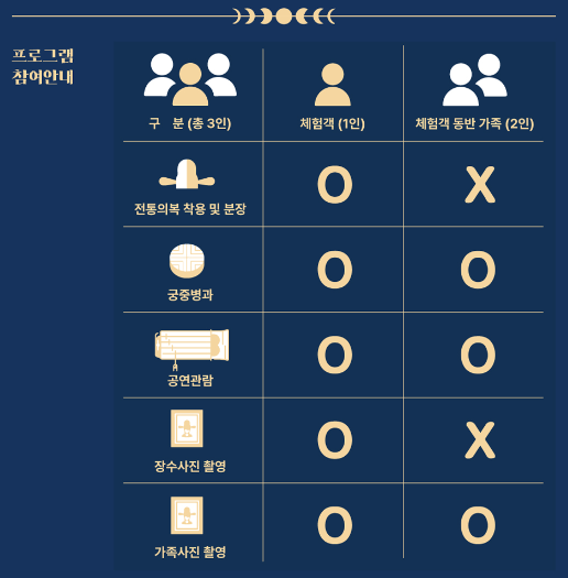 참가자 중 1인은 조선시대 전통복식 체험이 가능하고 그외 참여가족은 다른 프로그램은 동일하게 체험이 가능합니다.