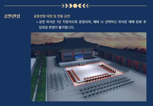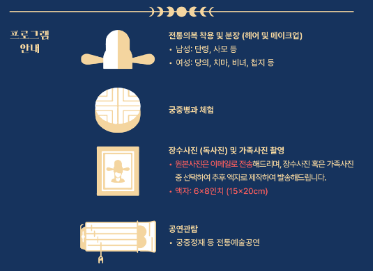 조선시대 궁중연행 재현, 전통복식 및 다과체험 등 공연과 체험이 결합된 문화 프로그램입니다.
