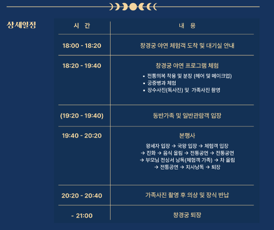 프로그램 상세일정은 다음과 같습니다. 전통의복 착용등 시간이 소요되므로 시간 준수가 반드시 필요합니다.