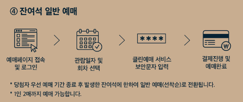 4. 잔여석 일반예매 당첨자 우선예매기간 종료 후 발생한 잔여석에 대해 일반예매로 전환됩니다. 1인당 2매까지 예매가 가능합니다.
