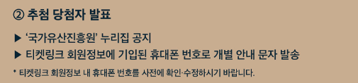 2. 추첨 당첨자 발표 확인 국산유산진흥원 홈페이지에 공지되며 예매권 응모 사이트 회원정보로 문자 안내됩니다.