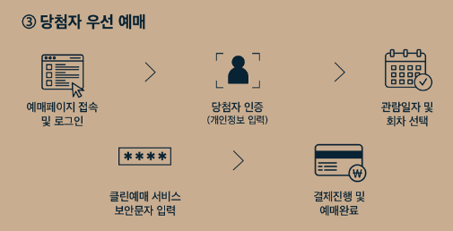 3. 당첨자 우선예매 응모한 사이트에 접속 및 로그인 후 당첨자인증 후 관람일자와 회차 선택 후 결제하면 예매가 완료됩니다. 이때 1인당 2매까지 예매가능합니다.